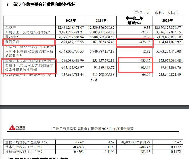 与此同时,兰石重装发布2025年度业绩报告。报告显示,2025年度,利润总额大幅下降475.65%,归属于上市公司股东的净利润下降483.45%,归属于上市公司股东的扣除非经常性损益的净利润下降805.44%。