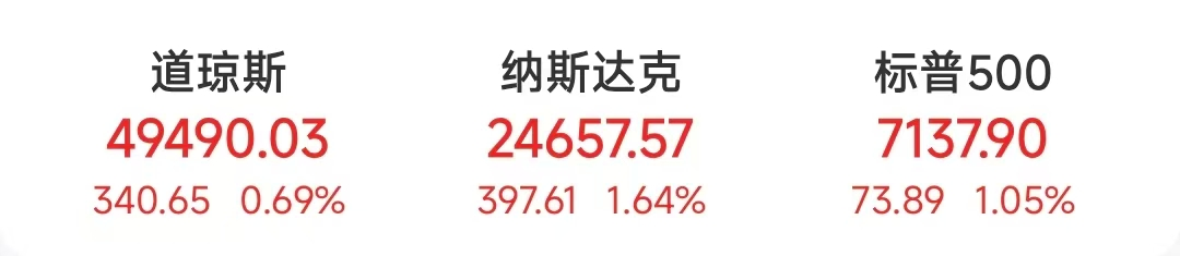 当地时间4月22日,美股三大指数收高,纳指创历史新高。道指收涨340.65点,涨幅为0.69%,报49490.03点;纳指涨397.61点,涨幅为1.64%,报24657.57点;标普500指数涨73.89点,涨幅为1.05%,报7137.90点。