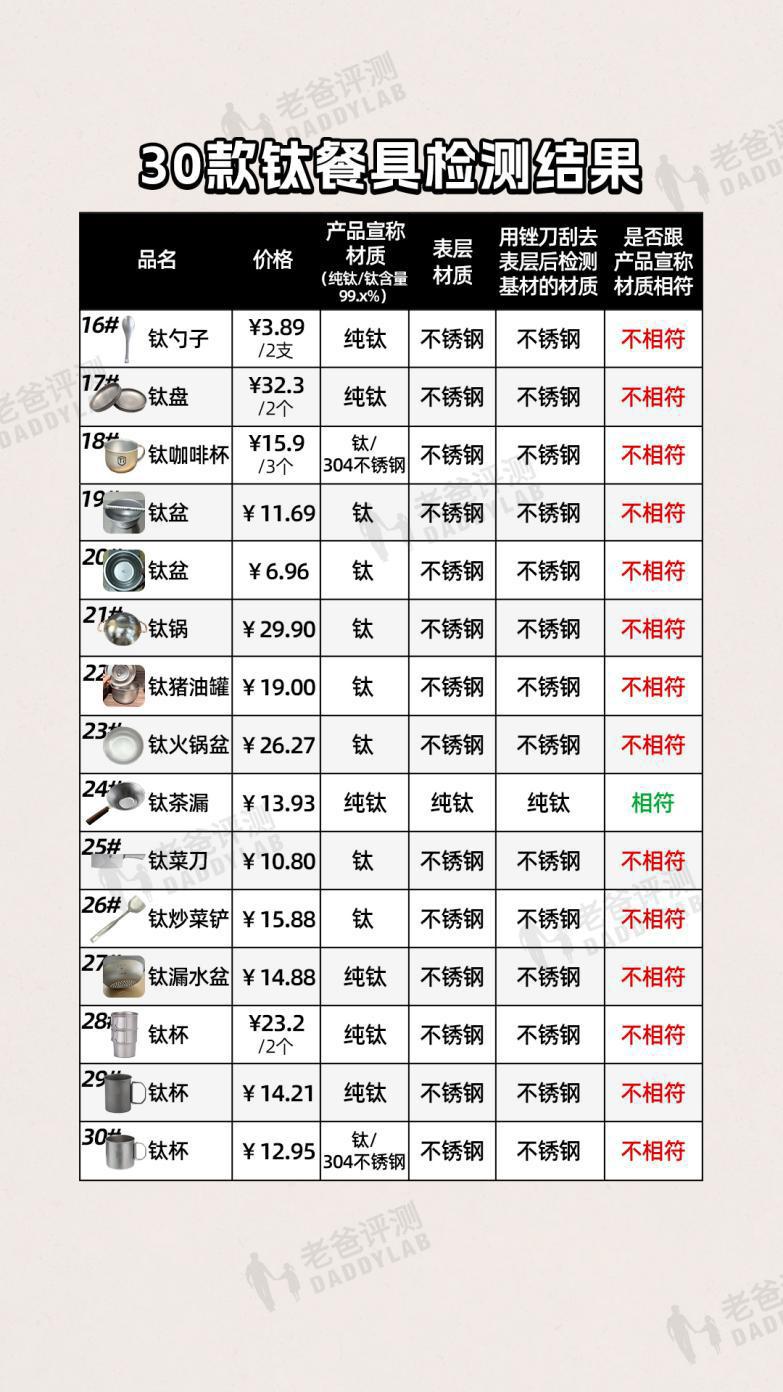 检测数据显示,30 款送检样品中,仅有不到四成符合工业纯钛材质标准,剩余超六成样品均为假冒产品。造假手段隐蔽性极强,多数不法商家采用普通不锈钢、铁合金基材,表面电镀一层薄钛膜伪装纯钛质感,外观颜色、重量、手感与正品高度相似,普通消费者仅凭肉眼、磁铁吸等方法完全无法分辨。部分低价劣质假货基材完全不含钛元素,本质就是劣质合金餐具,却公然标注纯钛材质高价售卖,严重误导消费。