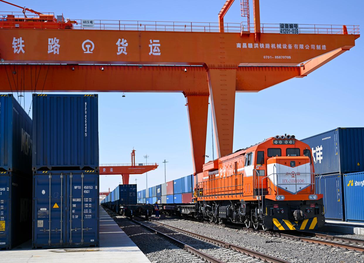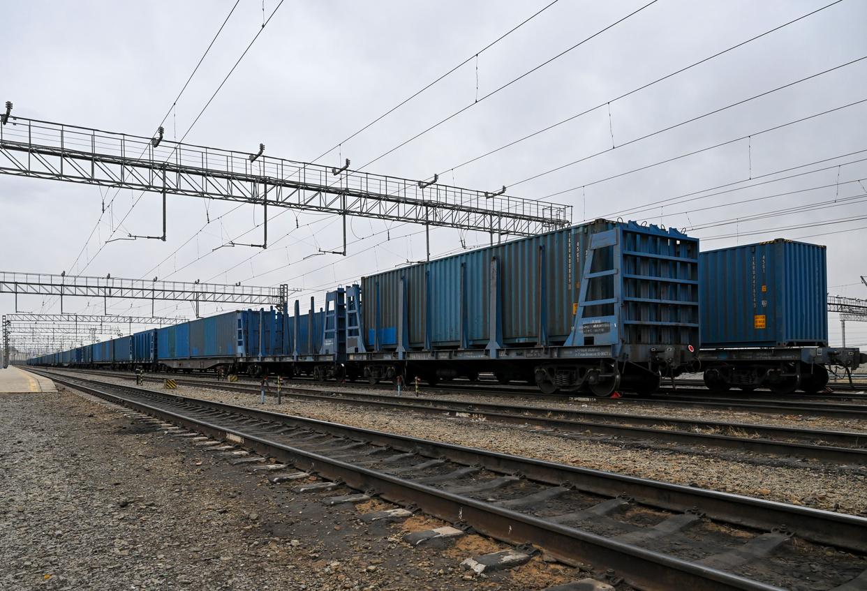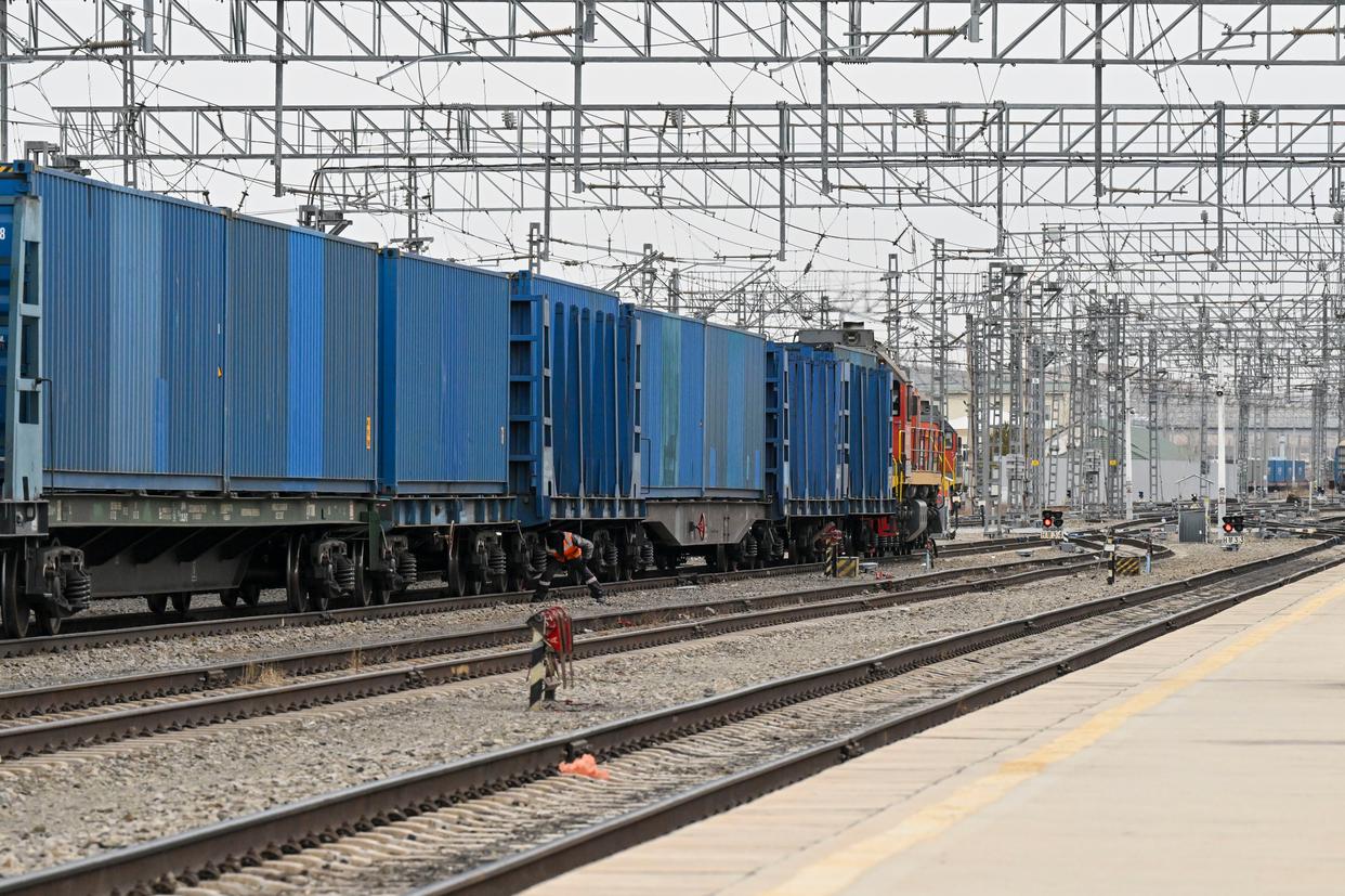 4月22日,货运列车停靠在俄罗斯外贝加尔斯克站。新华社记者 郝建伟 摄