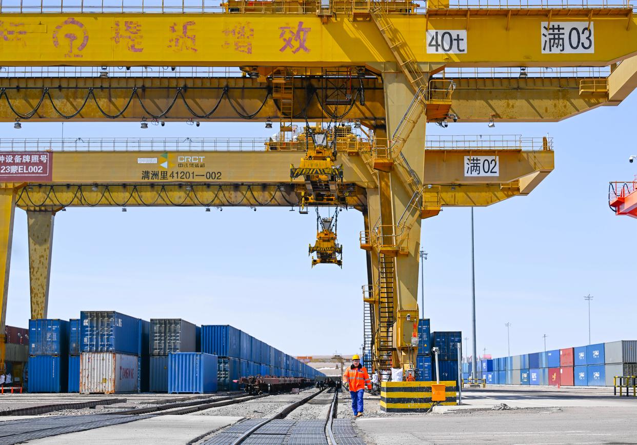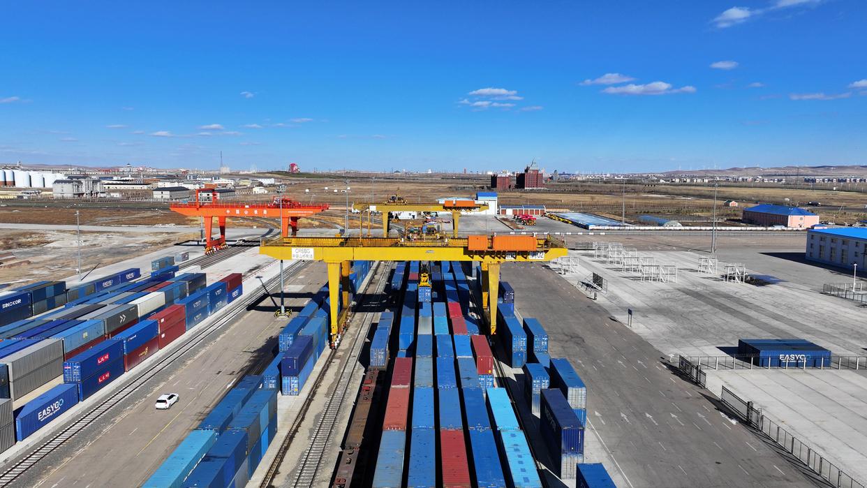 这是4月13日航拍的满洲里口岸铁路集装箱场(资料图片)。新华社发(中铁哈尔滨局满洲里站供图)