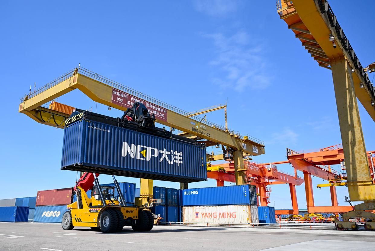 4月22日,作业车辆在满洲里口岸铁路集装箱场内装卸集装箱。新华社记者 彭源 摄