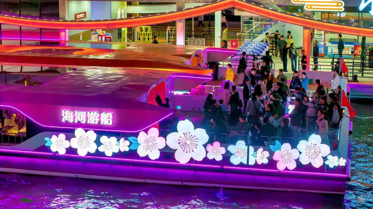 傍晚时分,天津永乐码头渐渐热闹起来。岸边,一艘以“海棠花”为设计核心的游船停靠在侧,明快轻盈的外观吸引不少游客驻足拍照。
