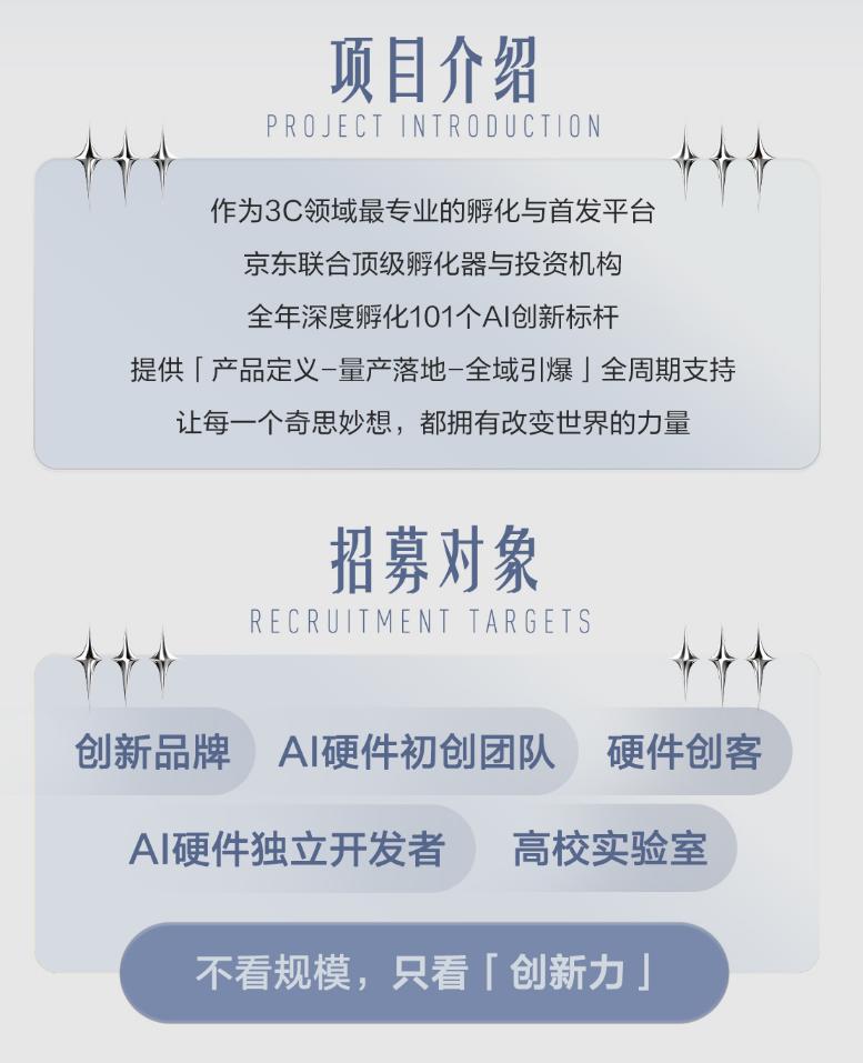 本次招募面向全球AI创新品牌、初创团队、硬件创客、独立开发者及高校科研实验室,申报项目没有企业规模或历史销售数据门槛,只看产品本身创新力与用户体验价值,凡具备明确技术路径与场景落地潜力的AI硬件项目均可参与。