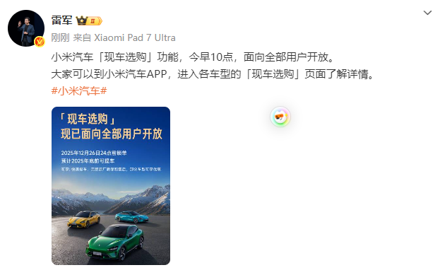小米汽车“现车选购”功能全面开放,部分车型可享优惠荆楚网 12-03