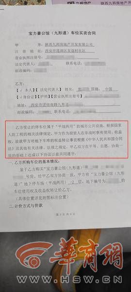 10月27日,华商报记者看到郭先生提供的宝力豪公馆(九形道)车位买卖合同上写着,该停车位属于“平战两用”的城市公共设施,根据国家人防工程的相关法律规定,甲方作为投资人在非战时享有使用、收益权。经甲乙双方协商一致,甲方将地下停车场(平战两用)负二层车位使用权及收益权转让给乙方,费用为14万元,使用权至2081年6月24日。