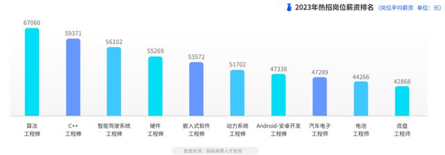 产业人才缺口引发大量新能源车企高薪抢人。《洞察》数据显示,2023年,超过1/3以上新能源汽车行业人才实现收入增长。其中,汽车电子工程师薪资增长幅度最大,月薪增幅达110%。其次是底盘工程师,月薪增幅为59%。集成电路IC设计、技术项目经理、动力系统工程师等核心技术岗位,均获得超过40%以上的月薪增幅。在2023年新发岗位中,算法?程师占据热招岗位以6.7万月薪领跑新能源汽?从业者薪资榜单。