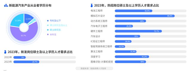 从现有从业者学历结构看,本科及以下学历的从业者占?超过77%,与芯?、??智能、?物医药等新经济?业相?,新能源汽??业对各学历?才的吸纳能?较强。然?,在2023年第一季度,核?技术岗位对从业者学历要求正逐步提?,新发招聘需求中,要求硕?及以上学历?才需求占?达到20.7%,同?增?11.7%。