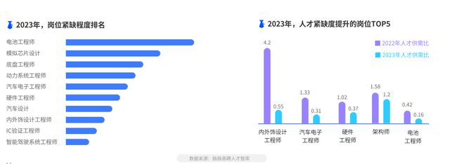 脉脉?聘?才智库特邀顾问、交通运输部科学研究院研究员熊燕舞认为,人才是新能源汽车企业增强核心竞争力的最重要的资源和灵魂,尤其是对高技术人才、设计研发人才有着较高的复合性和专业性要求。《洞察》数据显示,新能源汽车研发生产的核心环节,如三电、智能驾驶等,人才紧缺度极高。其中,电池工程师成为2023年最抢手的岗位,供需比只有6:1,相当于6个岗位争夺1个人才。