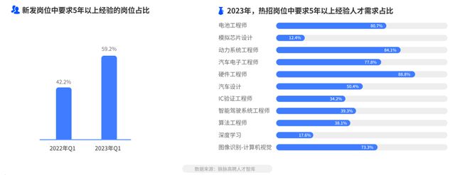 2023年第一季度新发招聘需求中,要求5年以上经验的?才需求占比达到59.2%,同比增?17%。电池?程师、动?系统?程师、硬件?程师、汽?电??程师岗位要求具备5年以上经验的?例更?,均达80%以上。