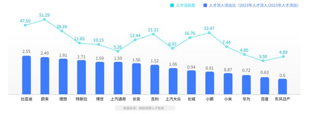 新能源汽车产业吸纳各行人才加入,?才流?是流出的1.65倍。从行业间?才流动方向来看,除了传统汽车外,互联网是新能源汽??业最主要的?才来源,其基因已深深地融入到新能源汽车企业中。从公司间的流动来看,蔚来、比亚迪、理想、小鹏、吉利成为新能源汽车产业人才活跃度最高的公司。