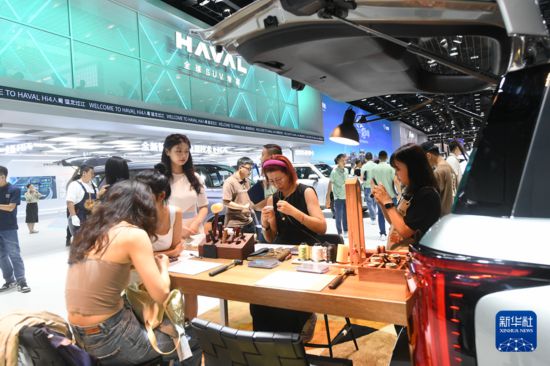 8月25日,在第二十六届成都国际汽车展览会现场,观众在体验手工皮具制作。新华社记者唐文豪摄