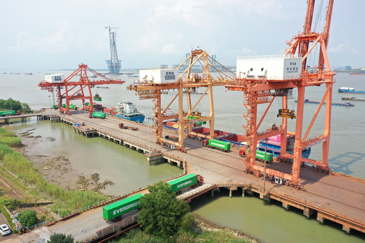 △常州录安洲码头上新能源整车排列整齐等待被吊装上船夏晨希摄