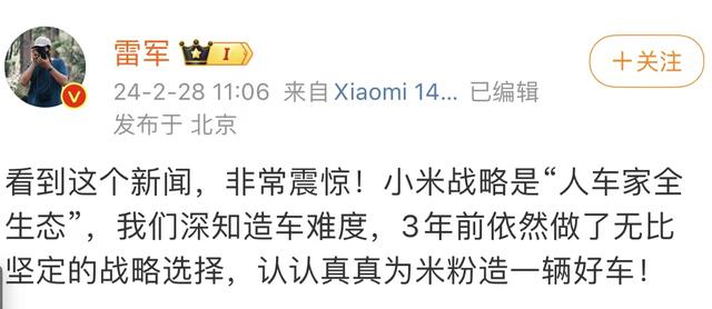 此消息引发热议,2月28日上午,雷军还曾发文称,看到苹果放弃造车的新闻非常震惊,小米战略是“人车家全生态”,3年前做了无比坚定的战略选择,认认真真为米粉造一辆好车。