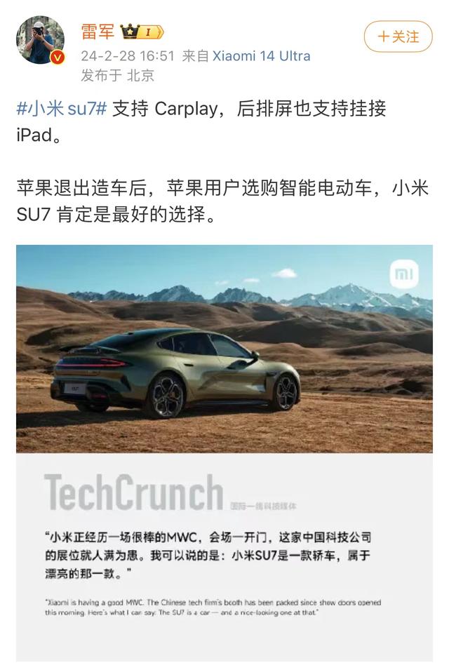 2月28日下午,雷军在微博发文称:苹果退出造车后,苹果用户选购智能电动车,小米SU7肯定是最好的选择。