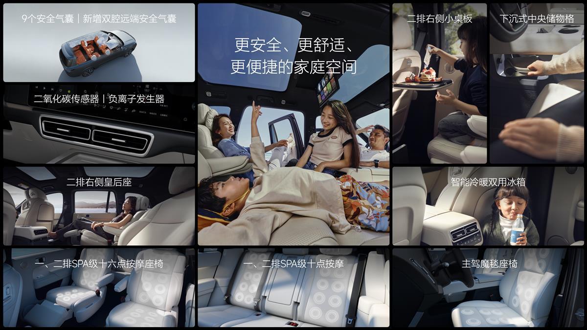 此外,2024款理想L系列全系舒适升级:2024款理想L9升级了专属的二排右侧皇后座、主驾魔毯座椅及一、二排四座SPA级十六点座椅按摩;2024款理想L7和2024款理想L8升级了SPA级十点座椅按摩,并提供智能冷暖双用冰箱等舒适配置。