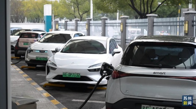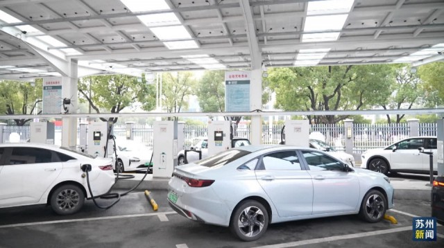 巨大的光伏板车棚,一字排开的智能充电桩。在苏州高新区邓尉路充电站,不少市民开着新能源车前来充电。
