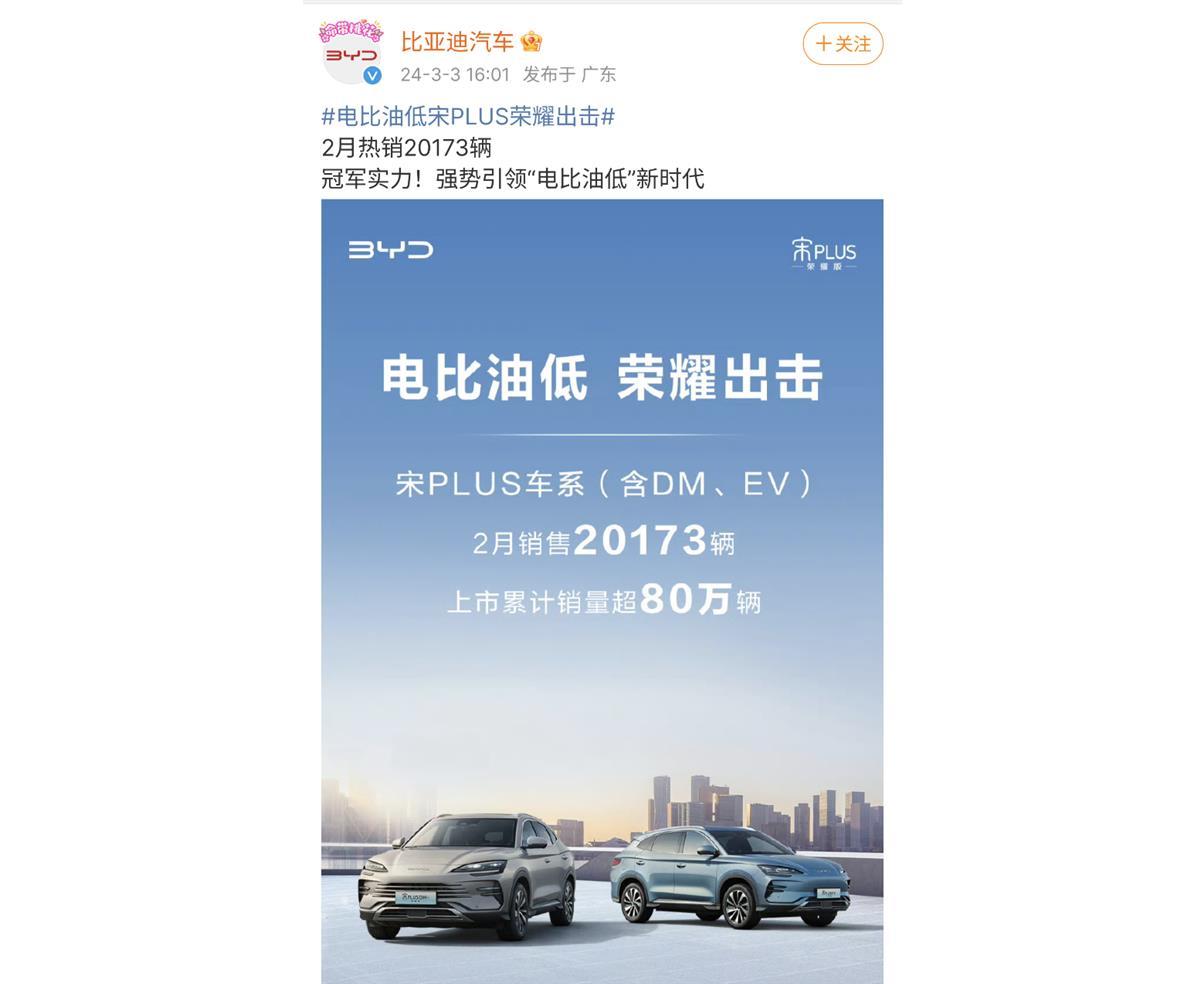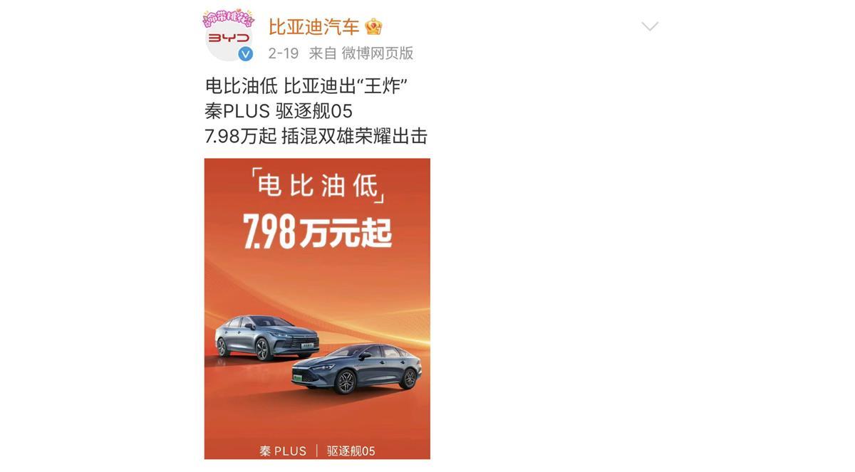 2月19日,龙年春节假期后的首个周一,比亚迪便打出“王炸”牌,推出“秦PLUS荣耀版”和“驱逐舰05荣耀版”两款新车型,最低售价7.98万元,并破天荒地喊出“电比油低”的口号。