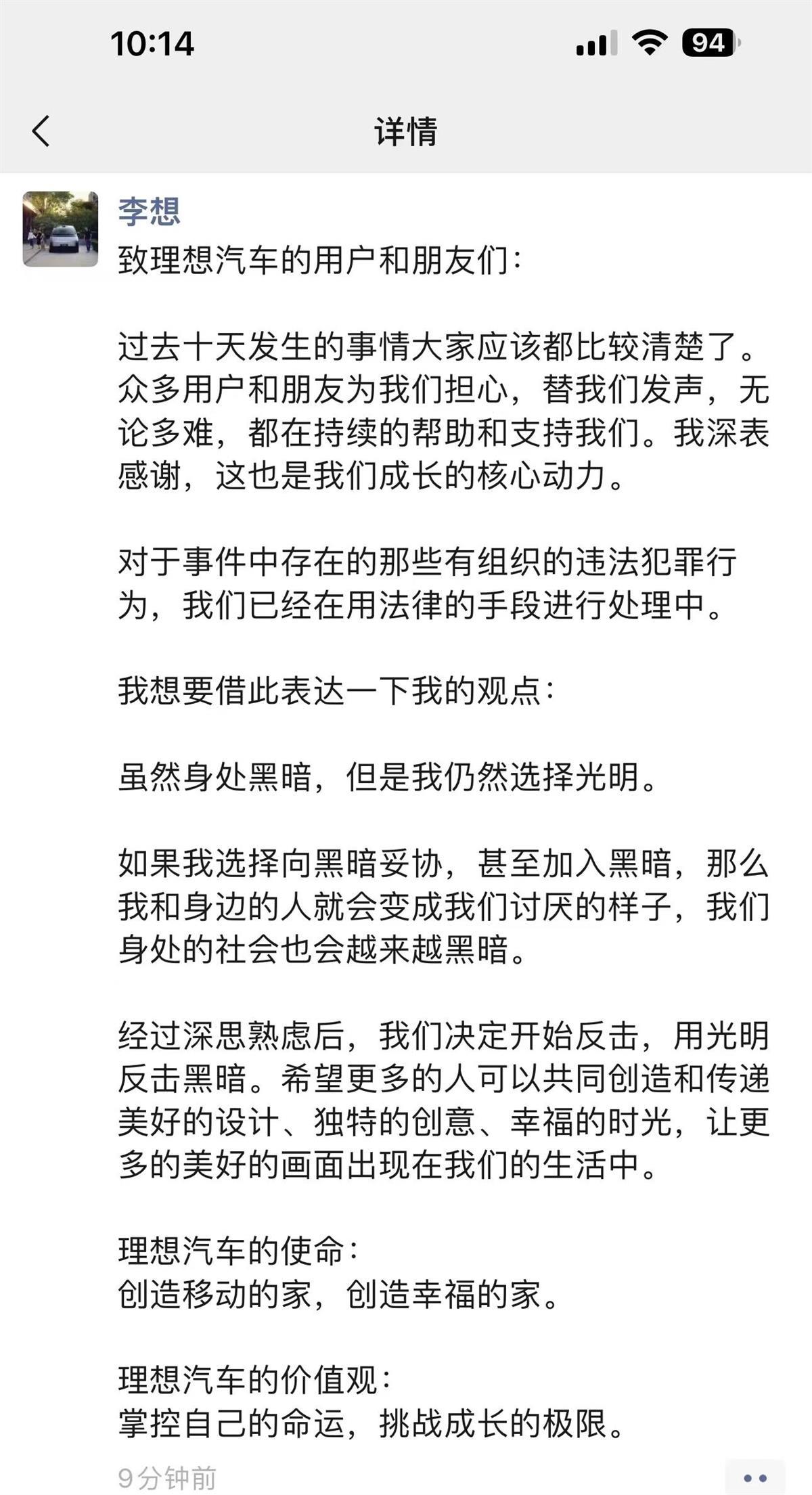 李想朋友圈发声