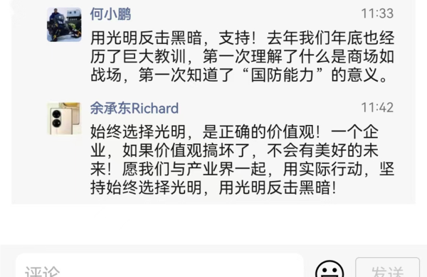 何小鹏留言称:用光明反击黑暗,支持!去年我们年底也经历了巨大教训,第一次理解了什么是商场如战场,第一次知道了 “国防能力”的意义。