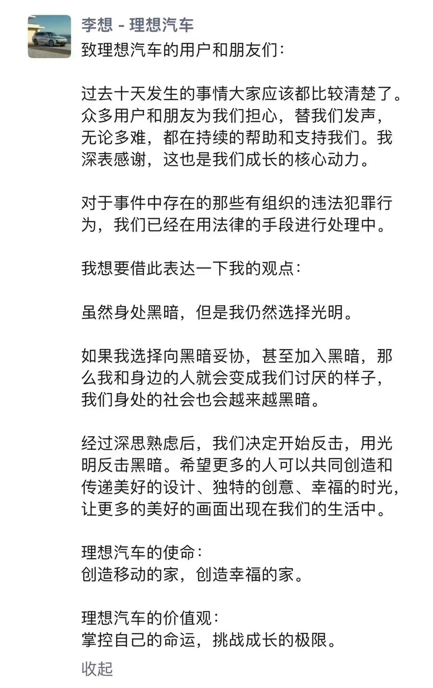 随后,李想又在朋友圈发布长文,表示“虽然身处黑暗,但是我仍然选择光明”,并声称“经过深思熟虑后,我们决定开始反击,用光明反击黑暗”。