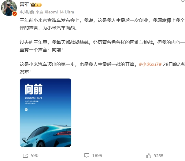 小米创办人、董事长兼CEO雷军在微博上称,“三年前小米官宣造车发布会上,我说,这是我人生最后一次创业,我愿意押上我全部的声誉,为小米汽车而战。过去的三年里,我每天都战战兢兢,经历着各色各样的困难与挑战。但我的内心一直有一个声音:向前!这是小米汽车迈出的第一步,也是我人生最后一战的开篇。”