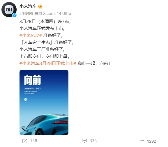 3月25日上午,小米汽车官方微博宣布,小米汽车将于3月28日(本周四)晚7点正式上市。