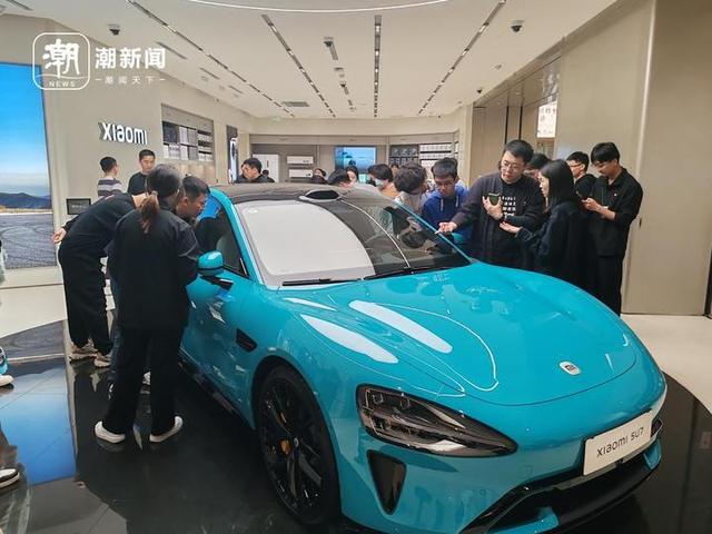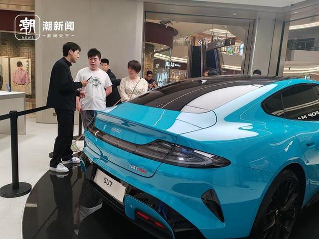 早上9点半,潮新闻记者来到小米之家拱墅区大悦城体验店,一辆海湾蓝色的小米SU7已经摆在店门口的显眼位置。尽管商场还没正式营业,一大波米粉已经聚集在门口,向销售了解车辆情况。不过,目前消费者只能在车外静态体验,并不能打开车门坐进车内感受内饰、车机等。