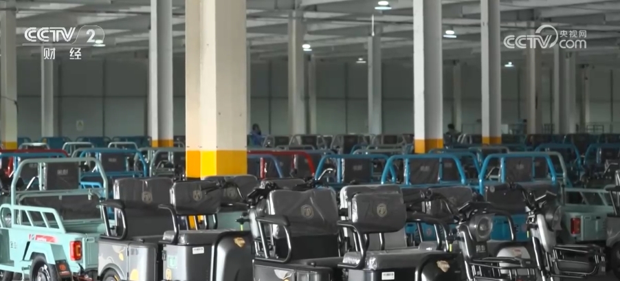 在江苏徐州的这家新能源车辆工厂,工作人员正在流水线上忙碌作业,组装生产新式的电动三轮车。在成品车辆存放区域, 崭新的电动低速四轮车和电动三轮车整齐排列,等待集装箱装车后统一发往欧洲。
