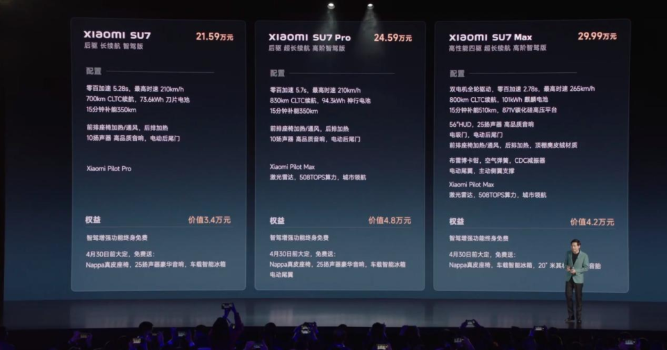 与此同时,SU7价格正式公布。小米SU7标准版售价21.59万元起,SU7 Pro售价24.59万元起,SU7 Max 29.99万元起。