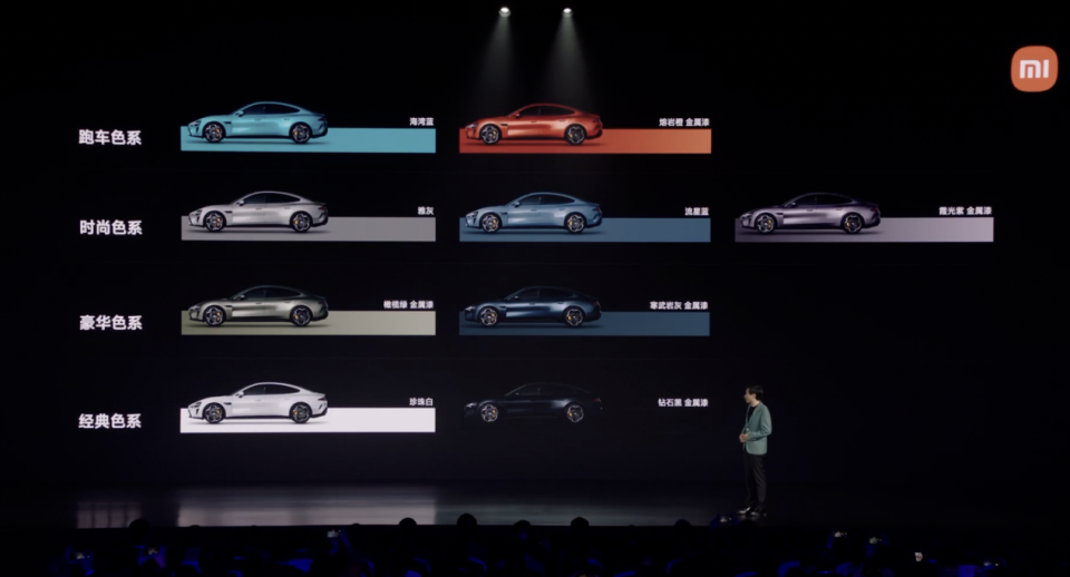 19:00整,小米SU7发布会开始,除了此前官方预发布的“海湾蓝、雅灰色、橄榄绿”三种颜色,雷军现场官宣了小米SU7全新六种配色,分别是霞光紫、流星蓝、熔岩橙、寒武岩灰、珍珠白、钻石黑,共计构成九种配色,对应四种风格。除了新配色,小米还宣布了SU7车型四款配色内饰,分别为银河灰、暮光红、迷雾紫、曜石黑。