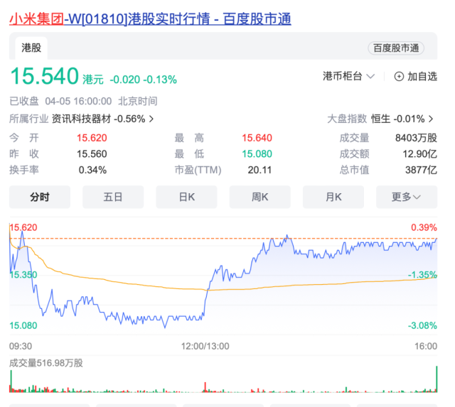 股价方面,小米集团今天微跌0.13%,报15.54港元/股,最新市值3877亿港元。