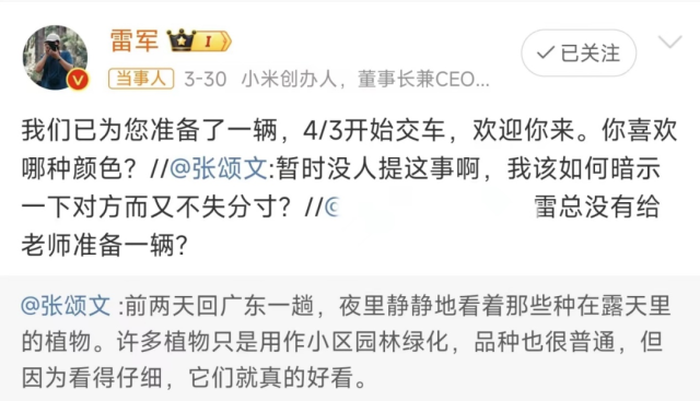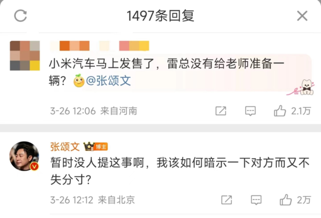 3月26日,有网友在上述微博的评论区问张颂文:“小米汽车马上发售了,雷总有没有给老师准备一辆?”张颂文回复称:“暂时没人提这事啊,我该如何暗示一下对方而又不失分寸?”