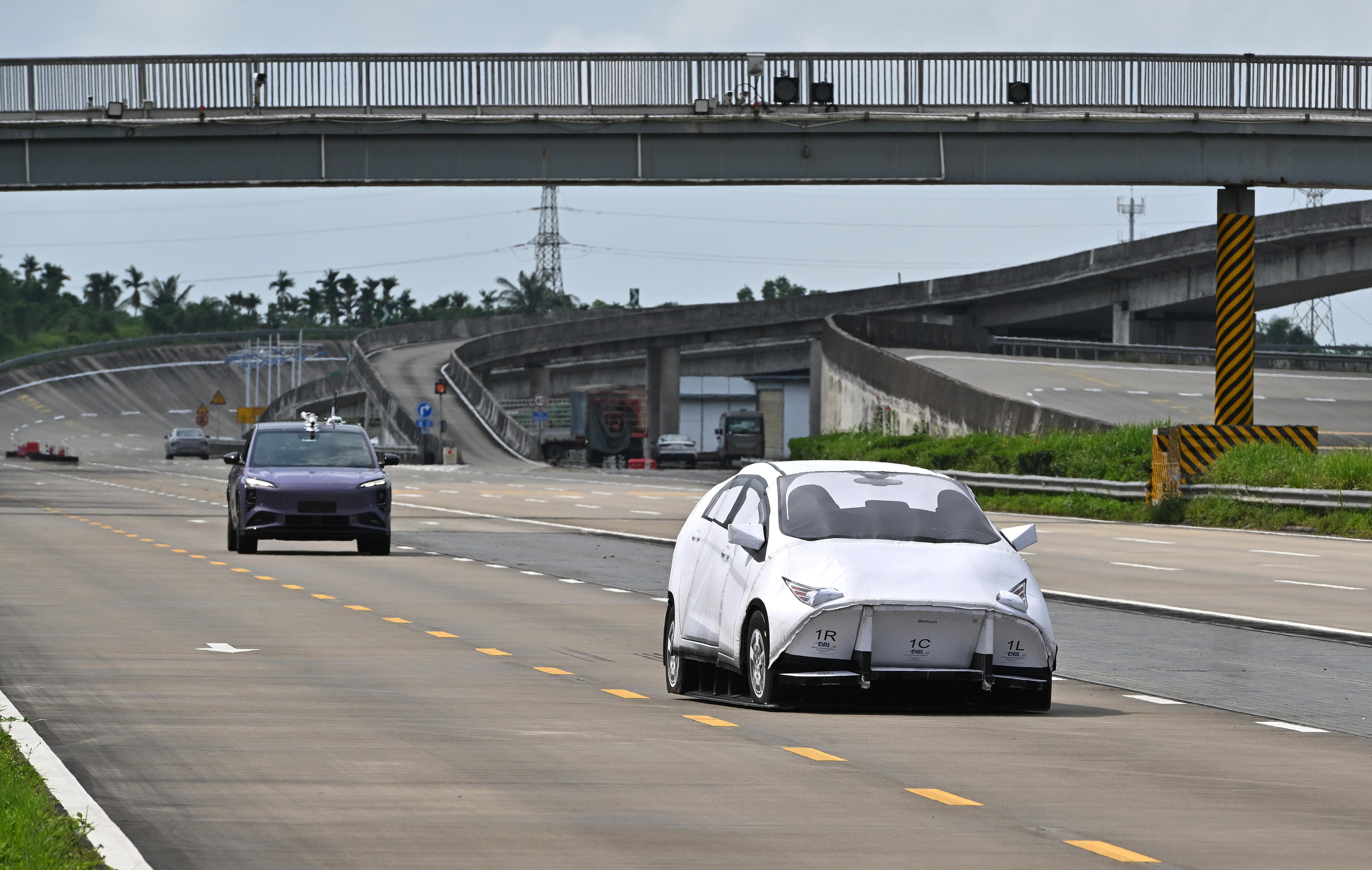 5月8日,汽车在进行自动紧急制动系统测试。 新华社记者 郭程 摄