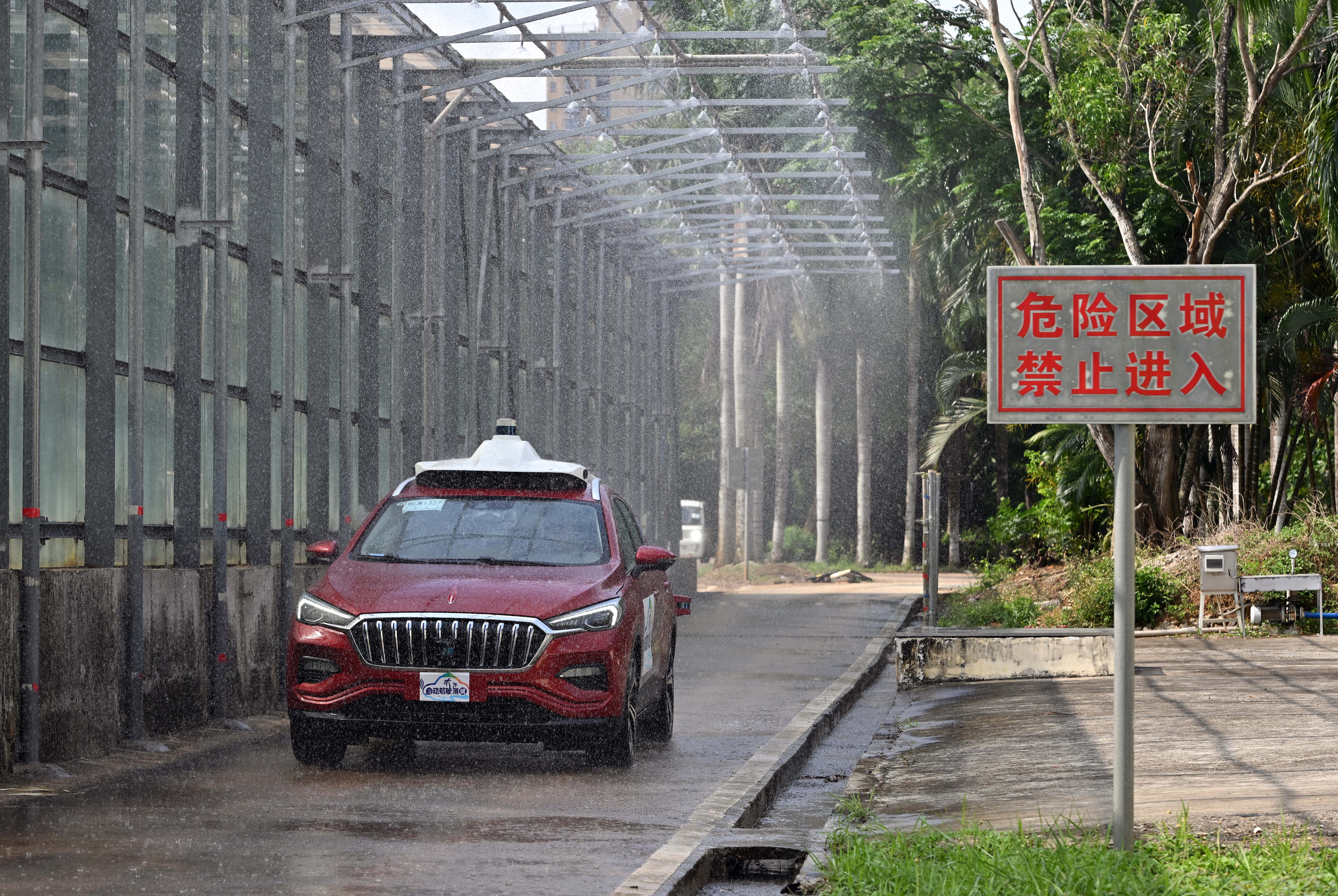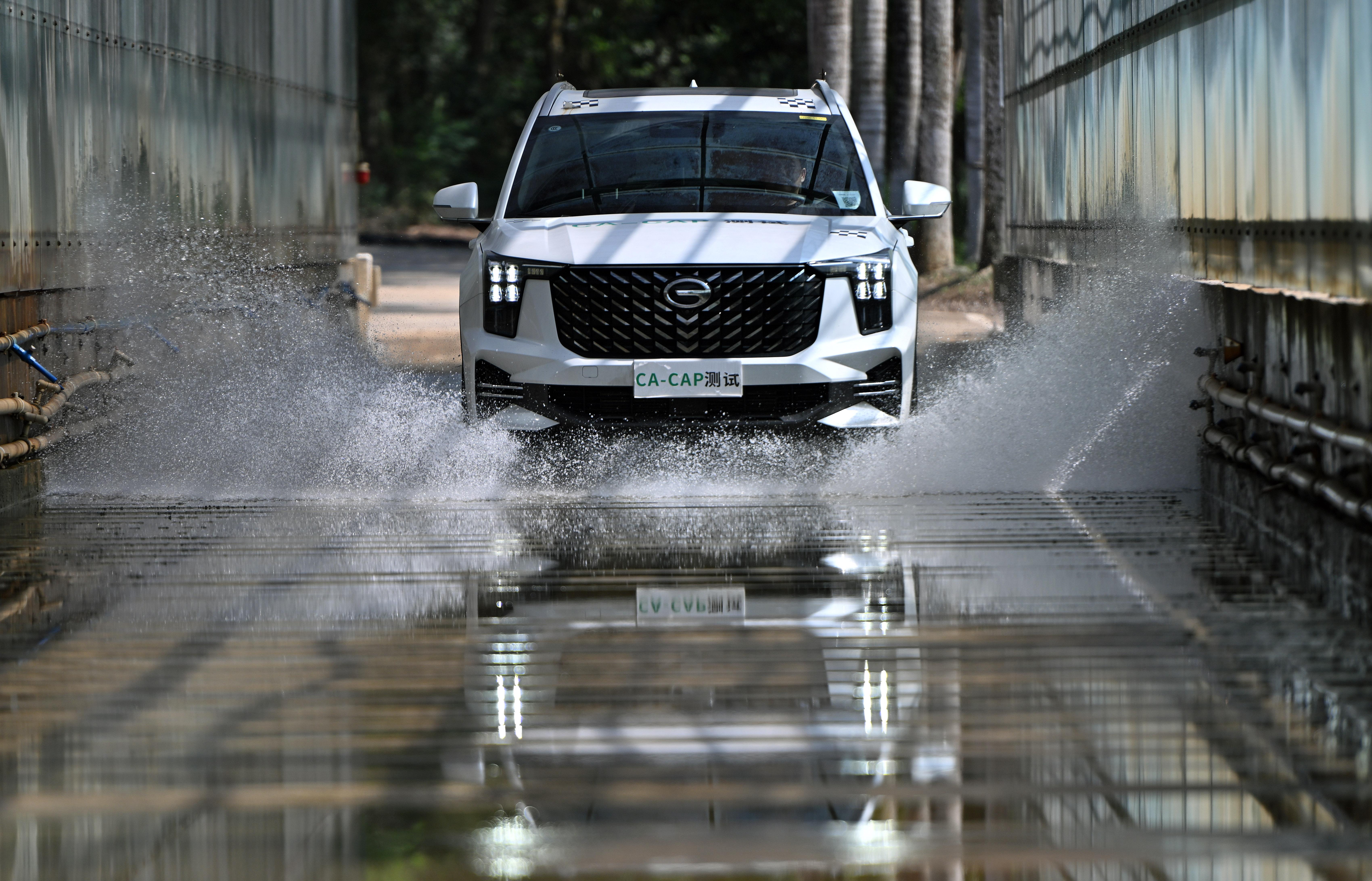 5月8日,汽车在进行自动驾驶淋雨测试。 新华社记者 郭程 摄