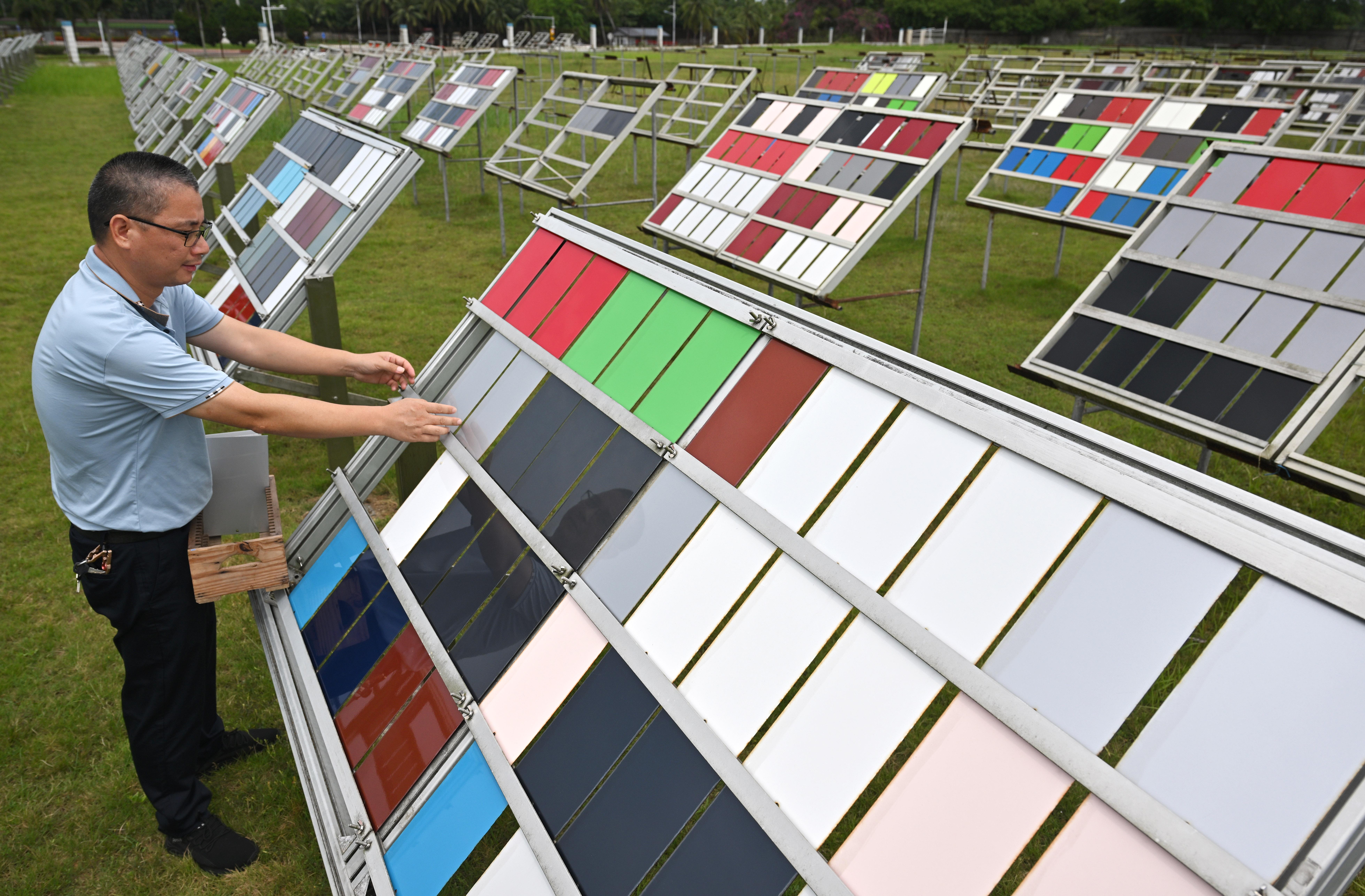 5月7日,工作人员对汽车油漆材料进行曝晒试验。 新华社记者 郭程 摄