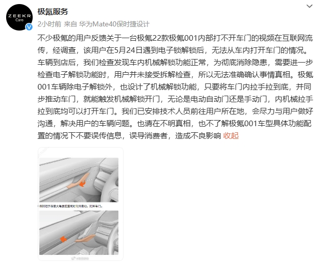 5月27日,针对极氪用户反馈“一台极氪22款极氪001内部打不开车门的视频在互联网流传”的情况,@极氪服务 回应称,上述车主在5月24日遇到电子锁解锁后,无法从车内打开车门,车辆到店后检查发现车内机械解锁功能正常,为彻底消除隐患,需要进一步检查电子解锁功能时,用户并未接受拆解检查,所以无法准确确认事情真相。