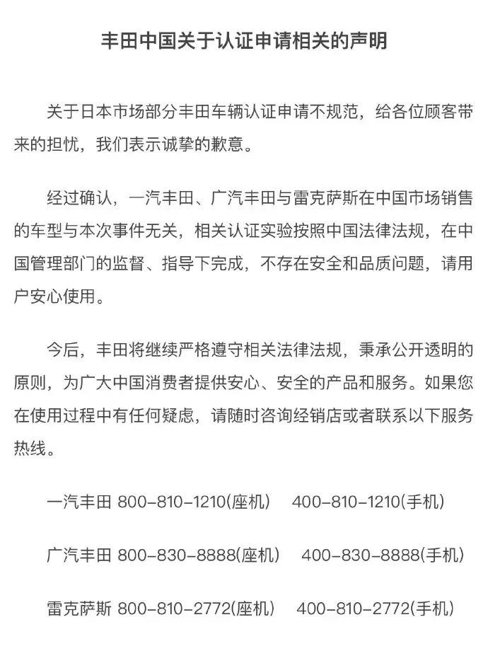 丰田中国:一汽丰田、广汽丰田与雷克萨斯在中国市场销售的车型与认证违规事件无关