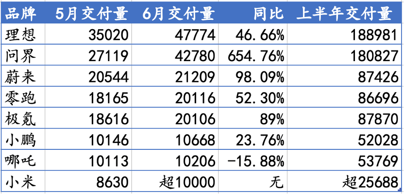 值得一提的是,包括问界、蔚来、极氪、零跑在内的几家企业均创下交付量新高。而刚开始交付三个月的小米汽车也实现了月交付过万辆,哪吒汽车是唯一一家交付量同步下滑的新势力。