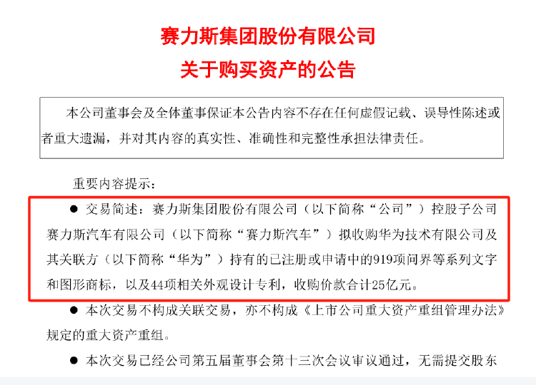 7月2日晚间,赛力斯公告称,拟收购华为持有的已注册或申请中的919项问界等系列文字和图形商标,以及44项相关外观设计专利,收购价款合计25亿元。