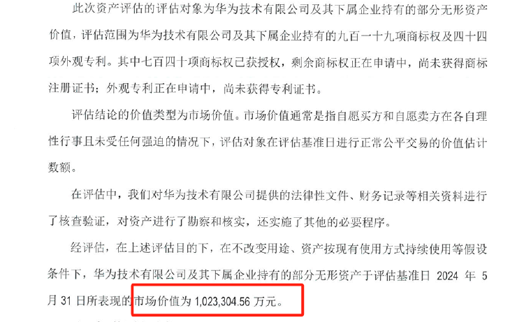 最终,评估报告表示,经评估,在前述评估目的下,在不改变用途、资产按现有使用方式持续使用等假设条件下,华为技术有限公司及其下属企业持有的部分无形资产于评估基准日2024年5月31日所表现的市场价值为102.33亿元。