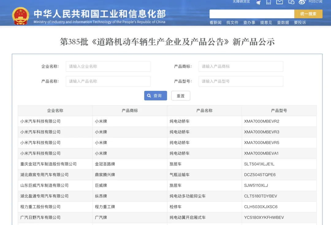 7月12日,在工信部官网披露的第385批《道路机动车辆生产企业及产品公告》新产品公示中,出现四款“小米牌”纯电动轿车,值得注意的是,其企业名称为“小米汽车科技有限公司”。去年11月15日,工信部发布《道路机动车辆生产企业及产品公告》(第377批),两款小米牌汽车正式亮相,企业名称为北京汽车集团越野车有限公司。