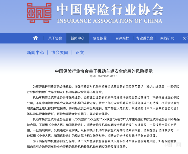 中国保险行业协会关于机动车辆安全统筹的风险提示