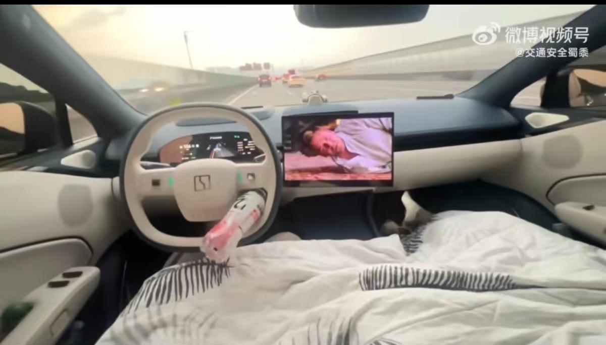 通过网传视频可以看到,车辆驾驶员将一个饮料瓶卡在方向盘上,中控大屏播放着视频,而驾驶者和副驾驶身上则盖着被子。整个视频中,驾驶员并未参与车辆驾驶,任由汽车自行在高速上穿行,速度保持在110Km/h。高速上车辆并不算少。不少网友评论,希望警方严查。