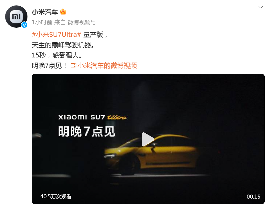 10月28日,小米汽车正式发布SU7 Ultra量产版预告片。