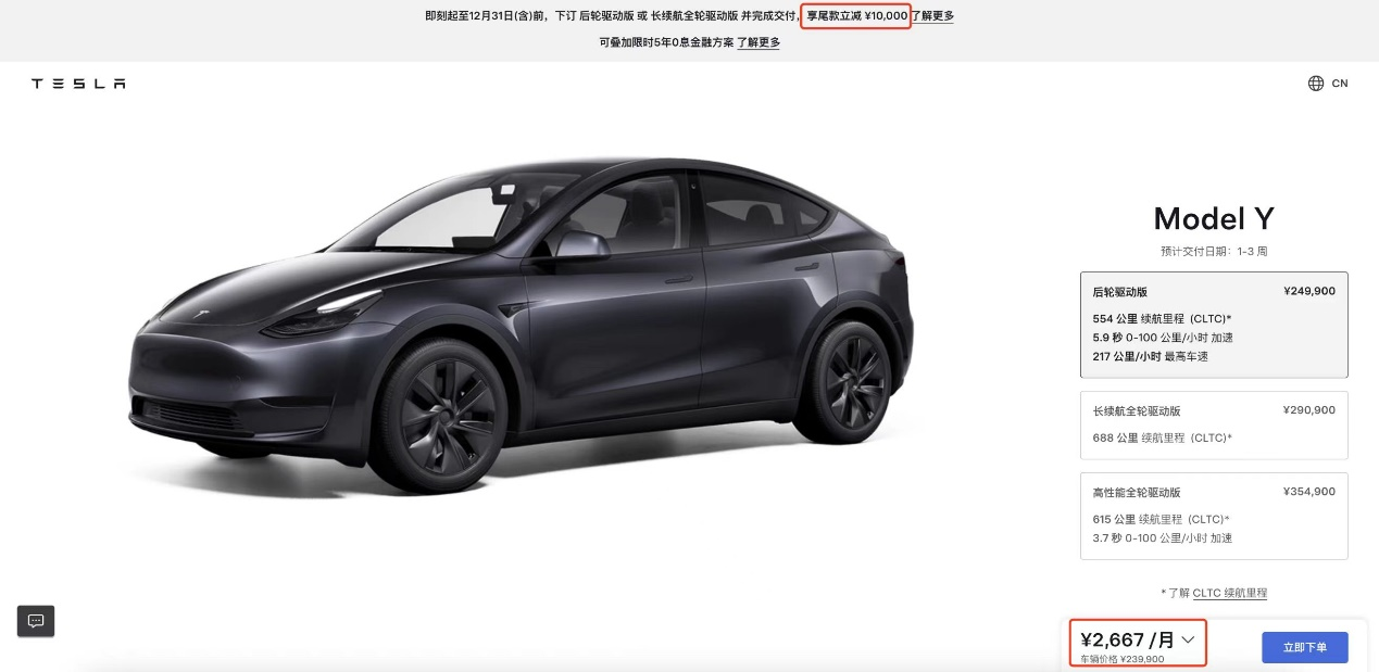 11月25日,特斯拉上线“限时交付,尾款立减”政策。在2024年12 月 31 日之前提走特斯拉 Model Y,即可享受价格直降 10000 元的超值优惠,售价23.99万元起!对消费者,这意味着每月仅需2667元,即可拥有这款电动汽车销冠。