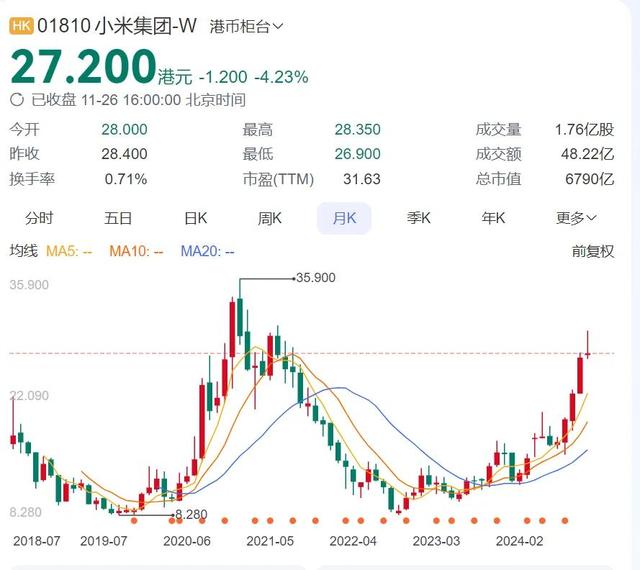 今年以来,小米股价持续上涨,截至11月26日收盘,小米股价报27.2港元,总市值6790亿港元(约合人民币6300亿元),年内涨超70%。