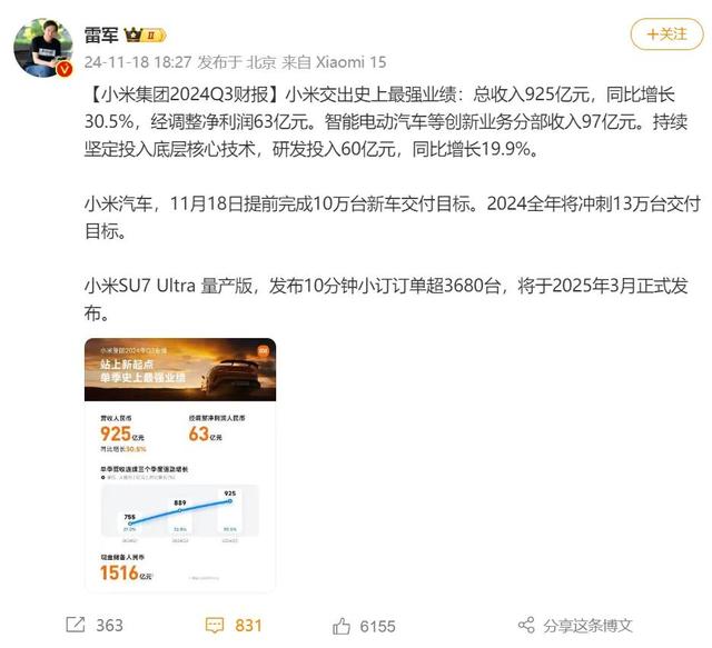 11月18日,雷军在微博发文称,小米交出了“史上最强业绩”。