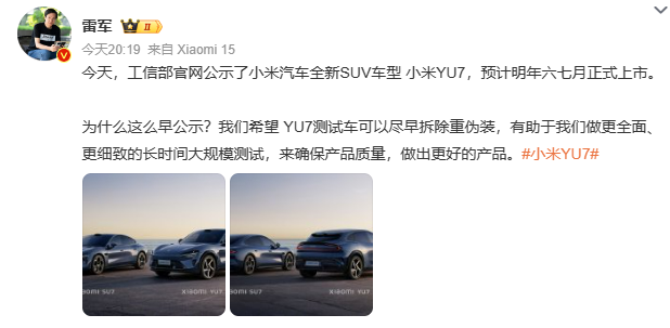 随后,雷军发文:今天,工信部官网公示了小米汽车全新SUV车型 小米YU7,预计明年六七月正式上市。