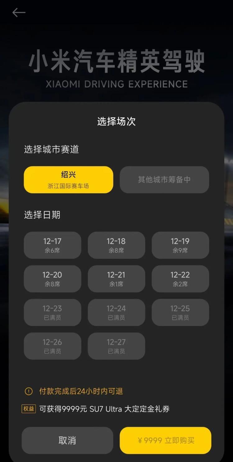 12月10日,小米汽车宣布,小米汽车精英驾驶项目报名开启,报名费为9999元。9999元包含体验费用、车辆租用、当日赛道保险、午餐及茶歇,不含交通住宿。报名时间是12月10日至12月24日。据介绍,参与者可获得“9999元的小米SU7 Ultra大定定金礼券”“专业赛道和漂移体验”“专属证书”等。